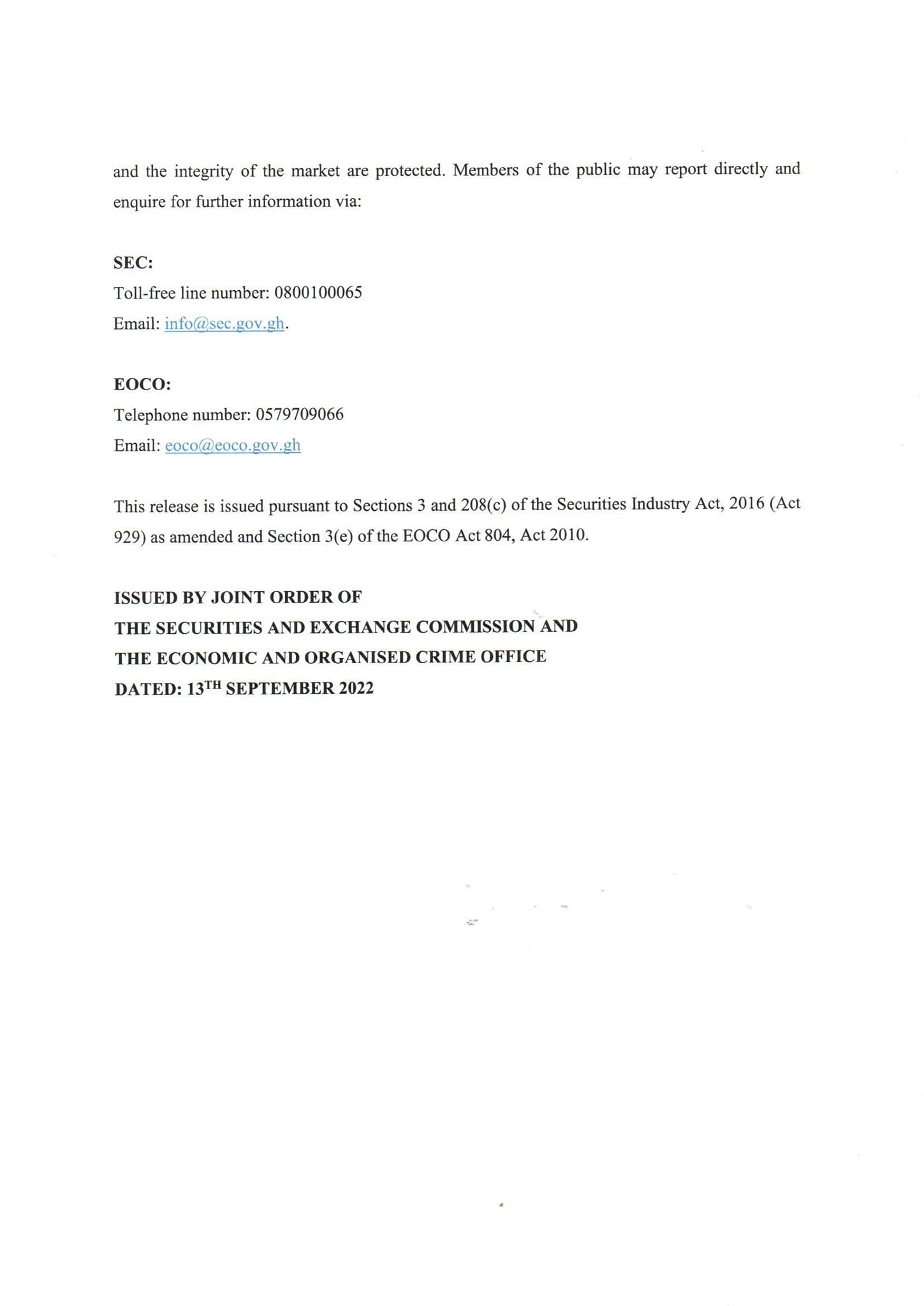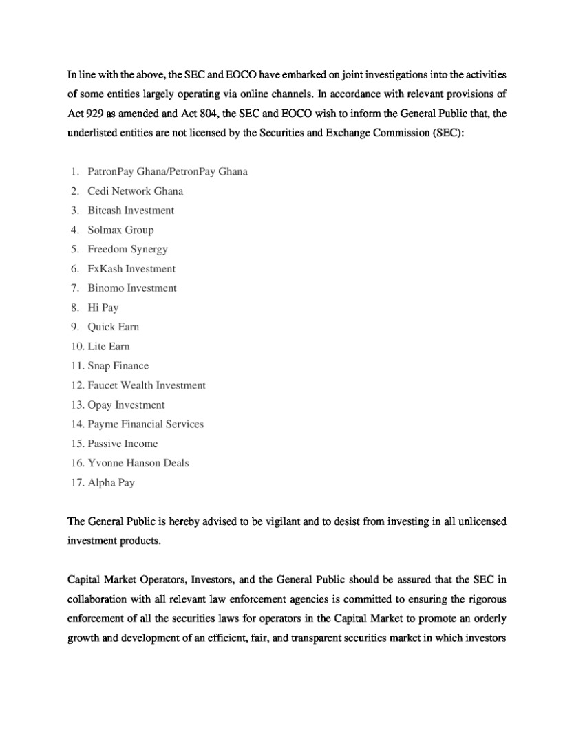 In line with the above, the SEC and EOCO have embarked on joint investigations into the activities of some entities largely operating ia online channels.