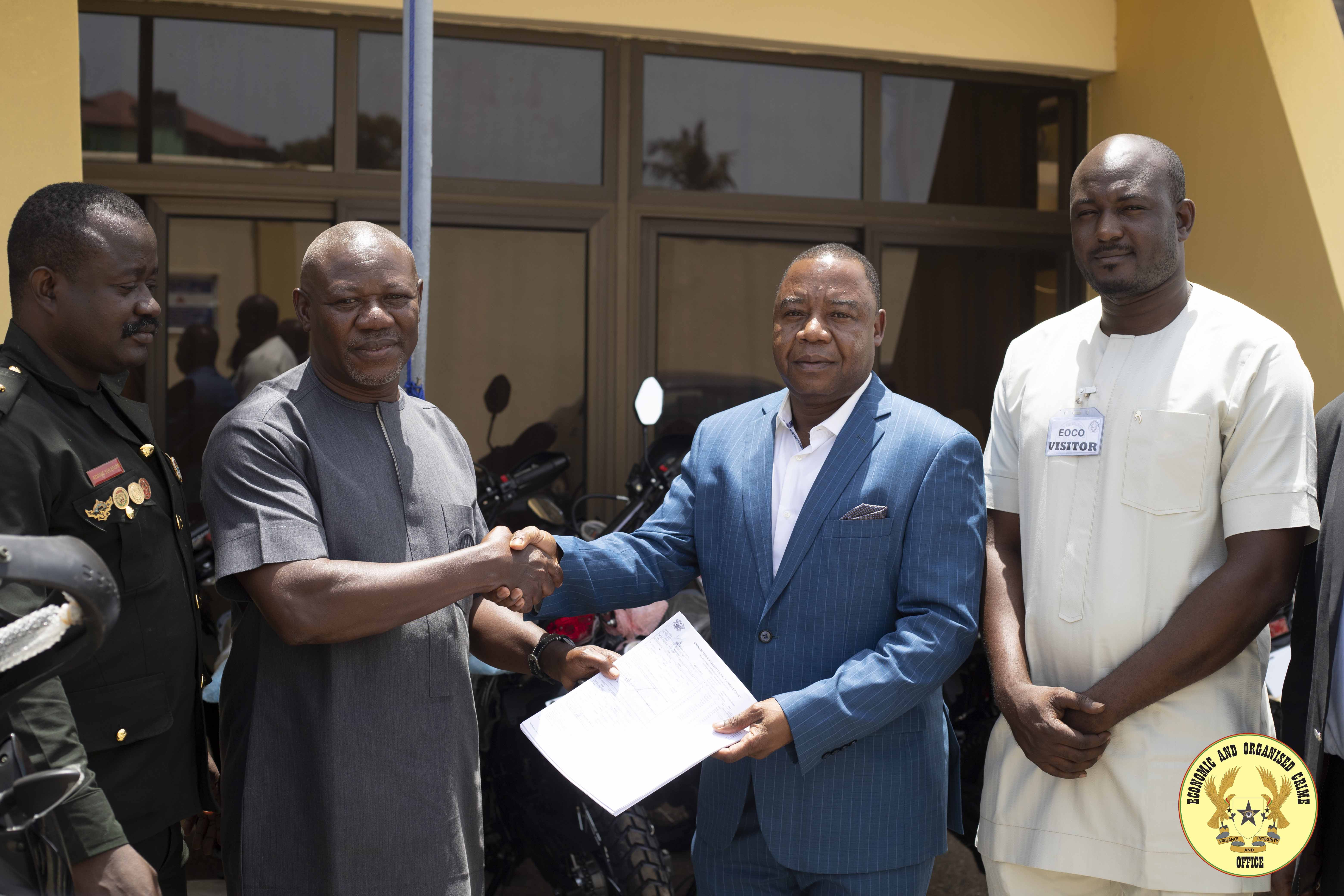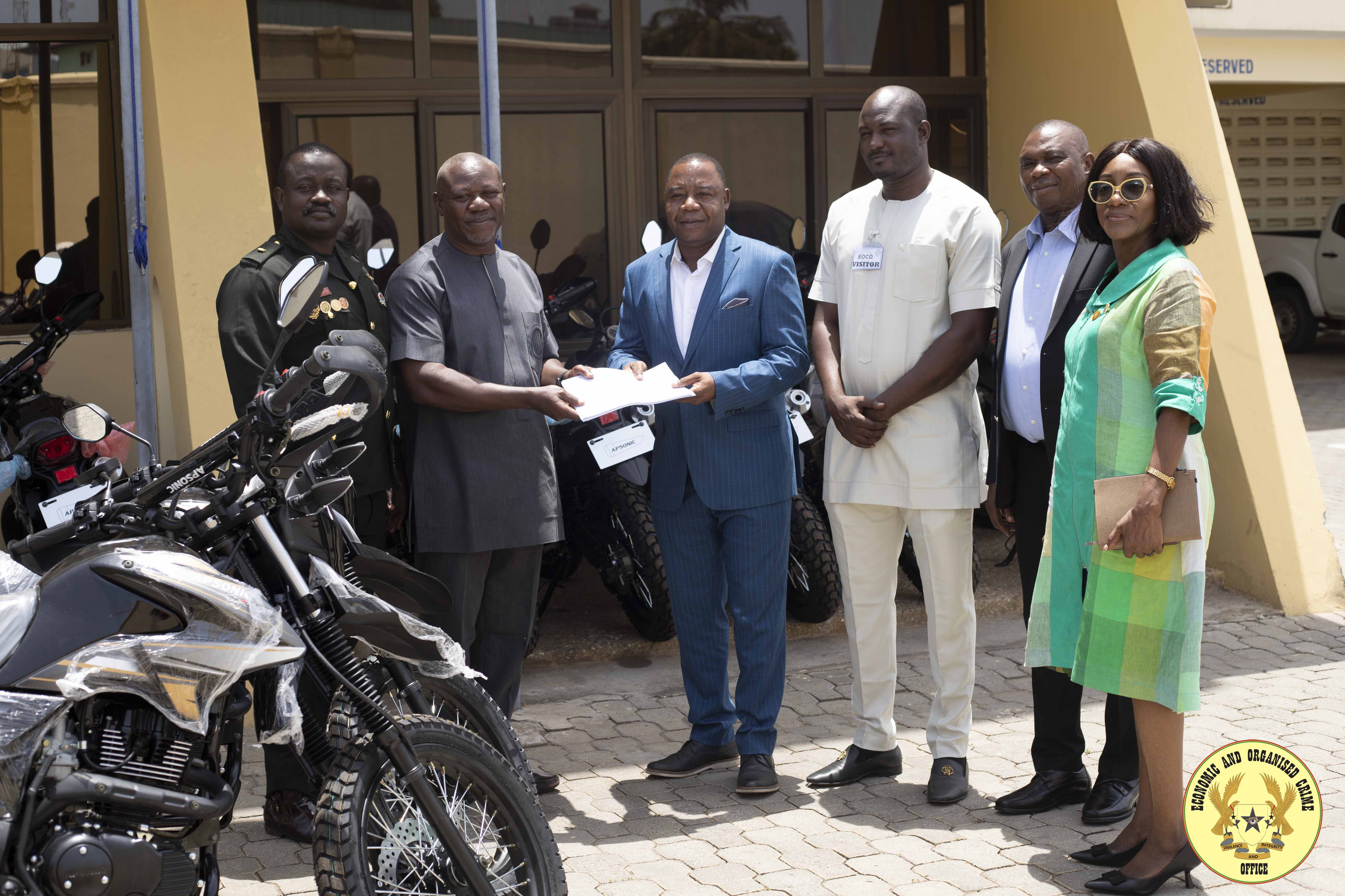 On April 14 2024, officials from New Modern World Company Limited, paid a courtesy call on the Ag. Executive Director of EOCO. The courtesy call was to congratulate and commend the Ag. Executive Director for the good job he has done so far. Additionally, as part of their corporate social responsibility, ten (10) motor bikes were donated to complement EOCO’s effort in the fight against Economic and Organise Crime.