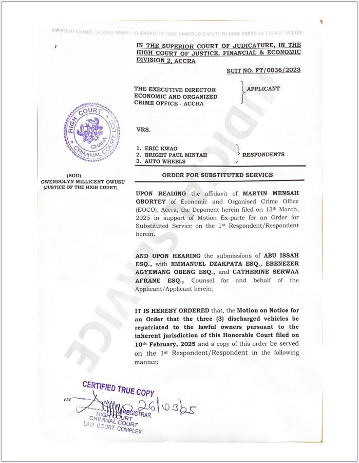 ORDER FOR SUBSTITUTED SERVICE (EOCO VRS. ERIC KWAO AND OTHERS)